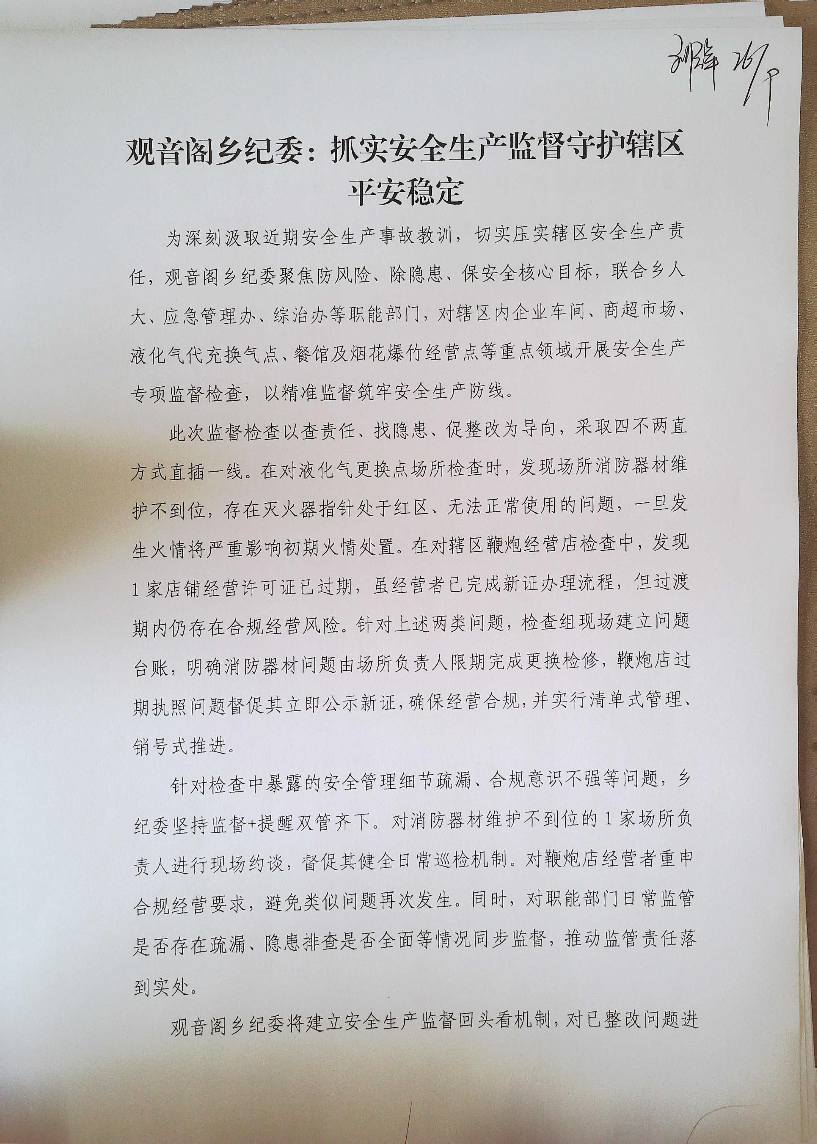 为深刻汲取近期安全生产事故教训,切实压实辖区安全生产责任,观音阁乡纪委聚焦防风险、除隐患、保安全核心目标,联合乡人大、应急管理办、综治办等职能部门,对辖区内企业车间、商超市场、液化气代充换气点、餐馆及烟花爆竹经营点等重点领域开展安全生产专项监督检查,以精准监督筑牢安全生产防线。